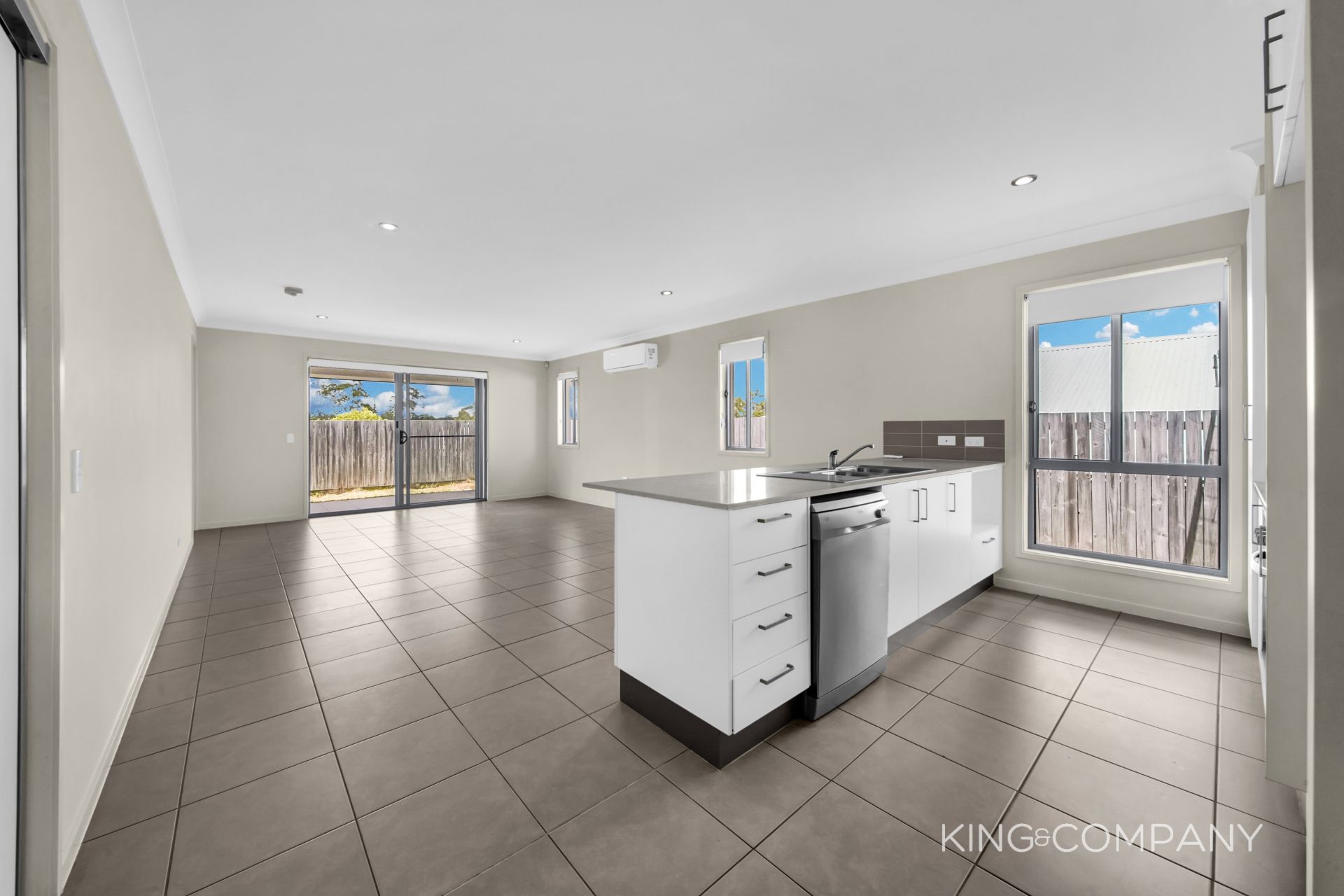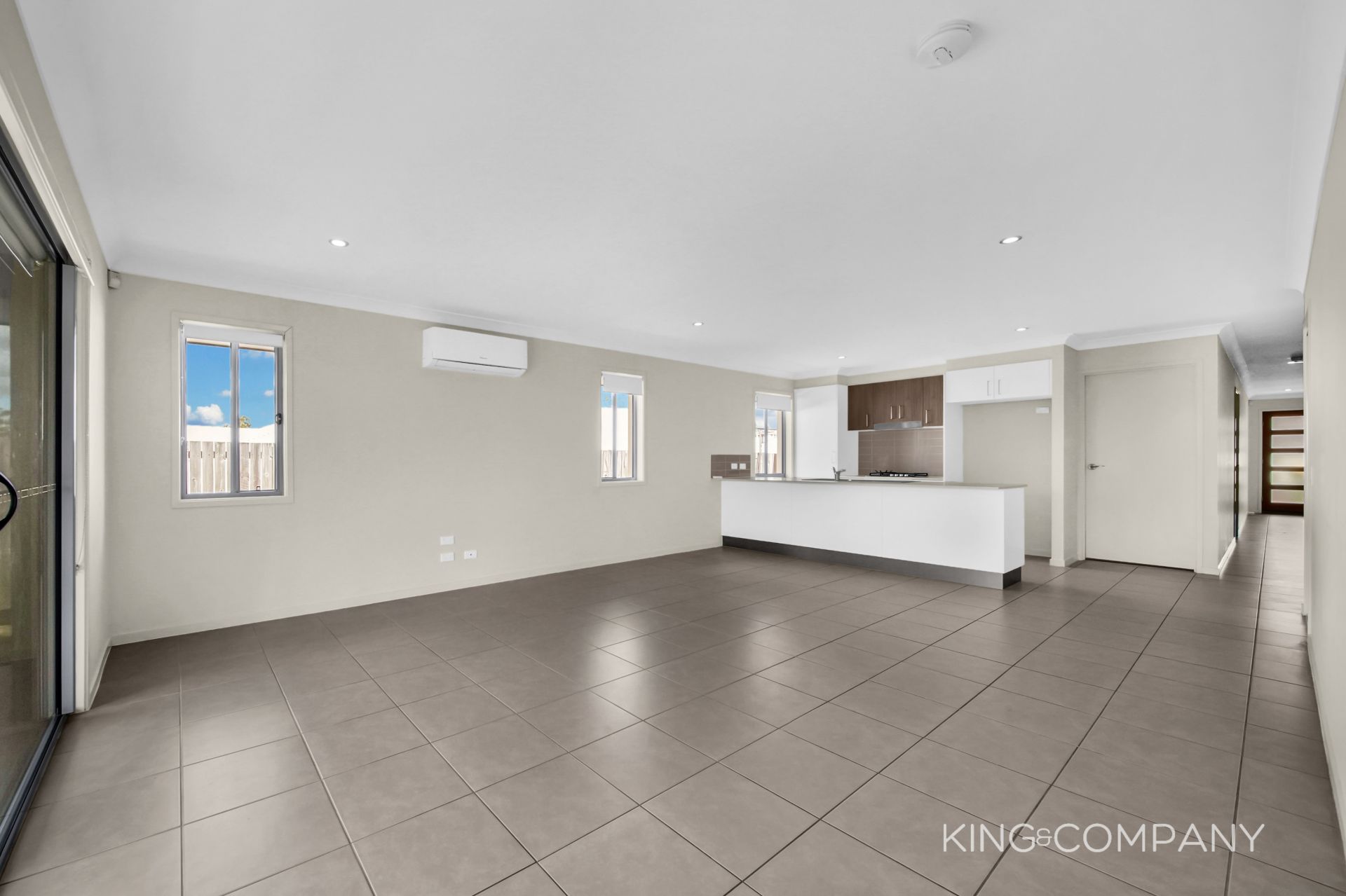 | Open plan tiled living & dining space with doors to alfresco