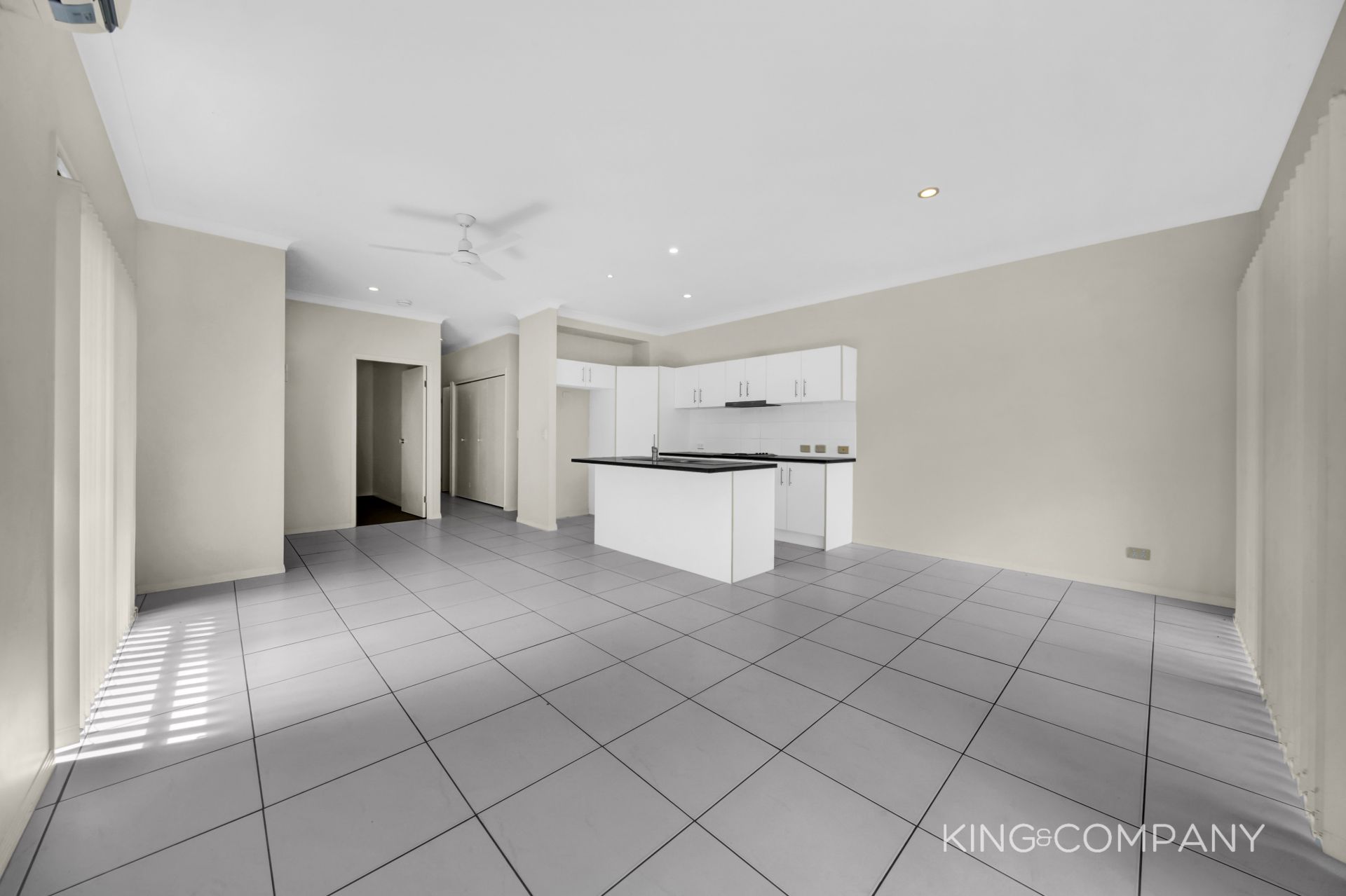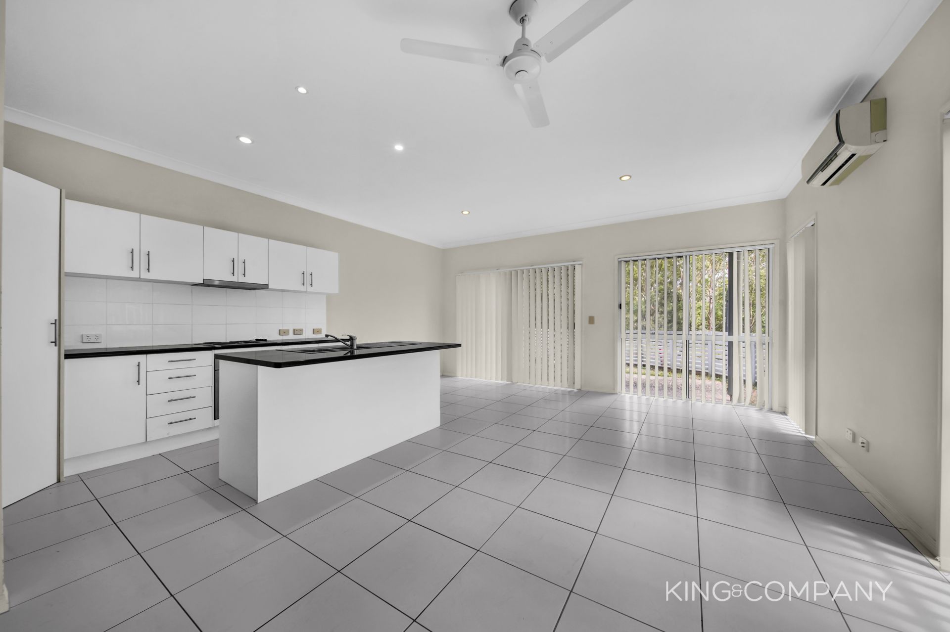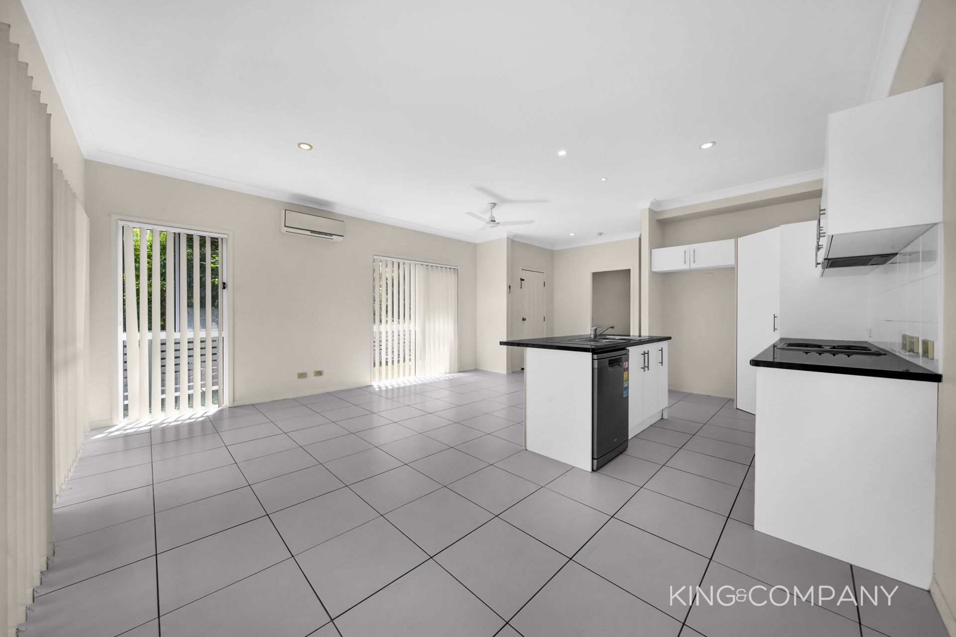 | Open plan tiled living & dining space with doors to alfresco & air conditioning