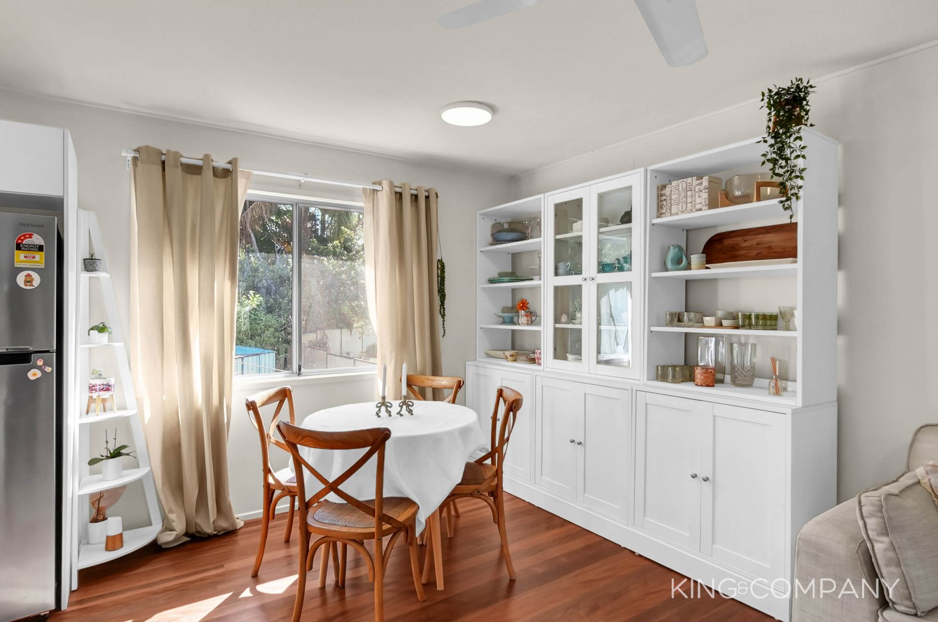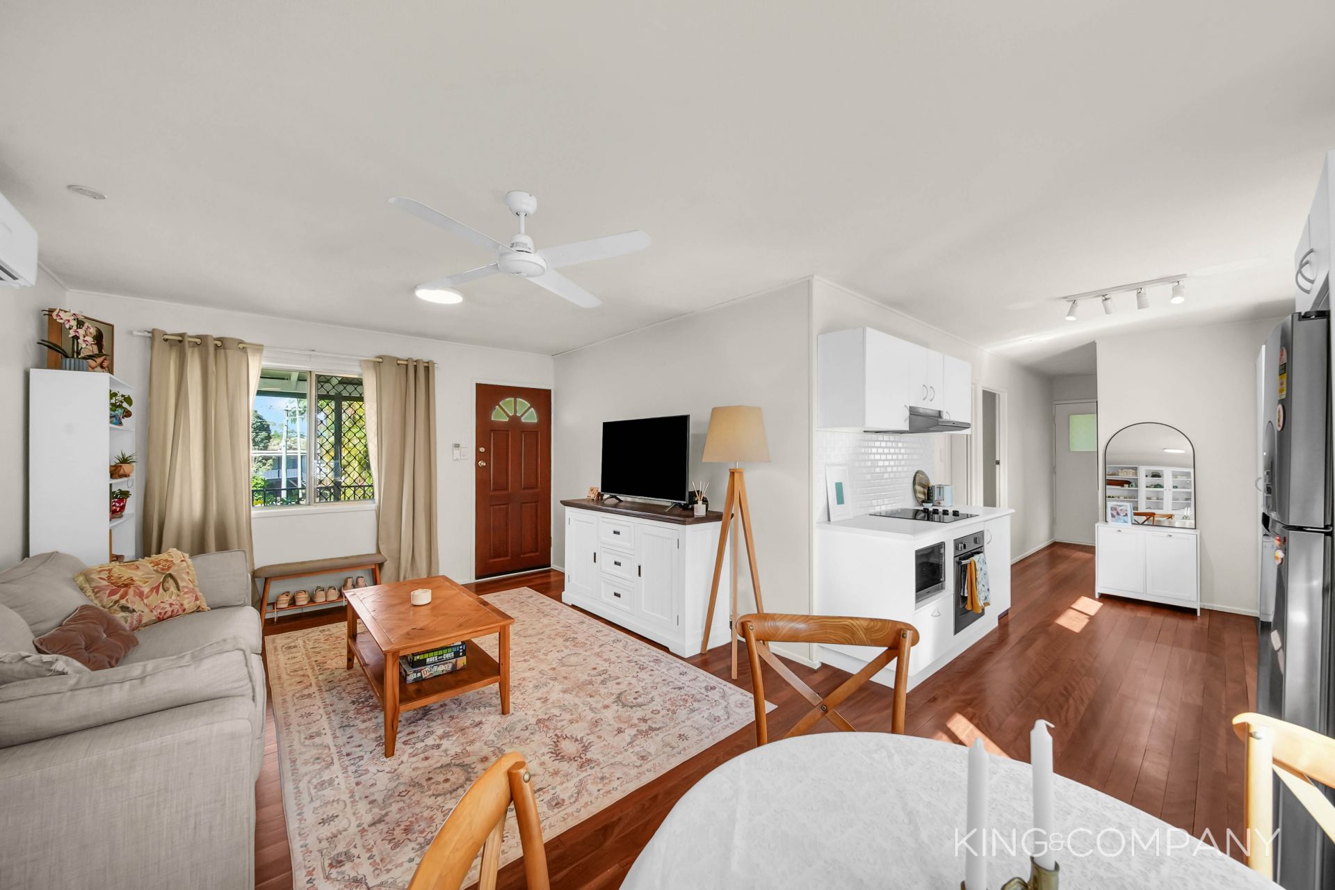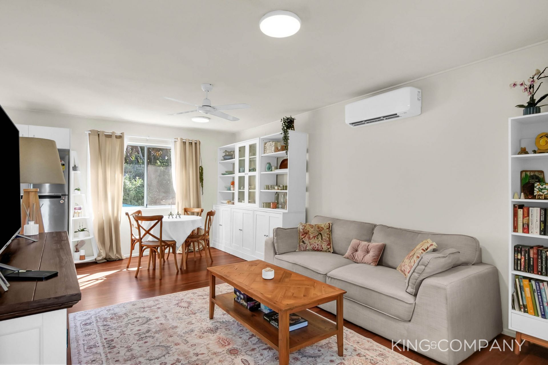 | Combined lounge room & dining space with air-conditioning & ceiling fan