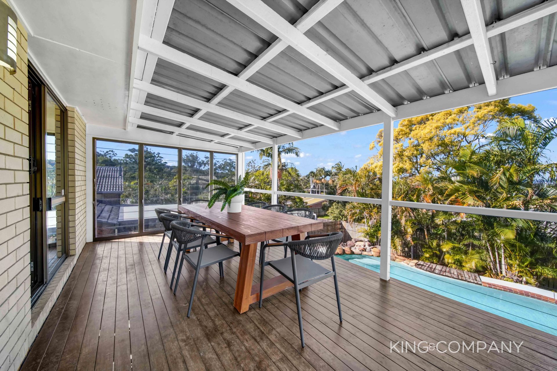 | Huge entertaining deck off dining space with stairs to backyard
