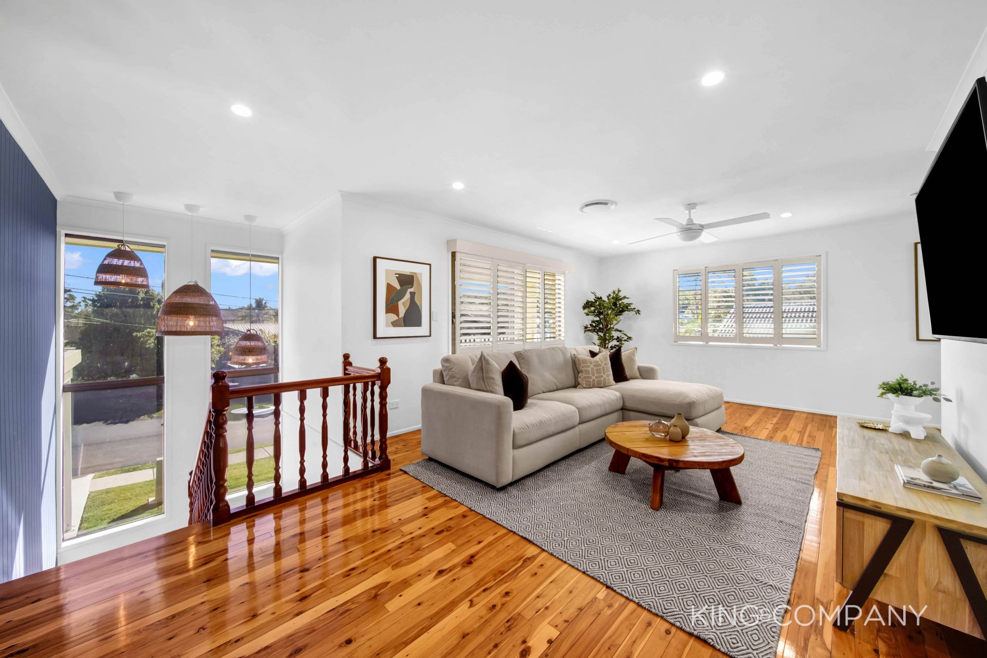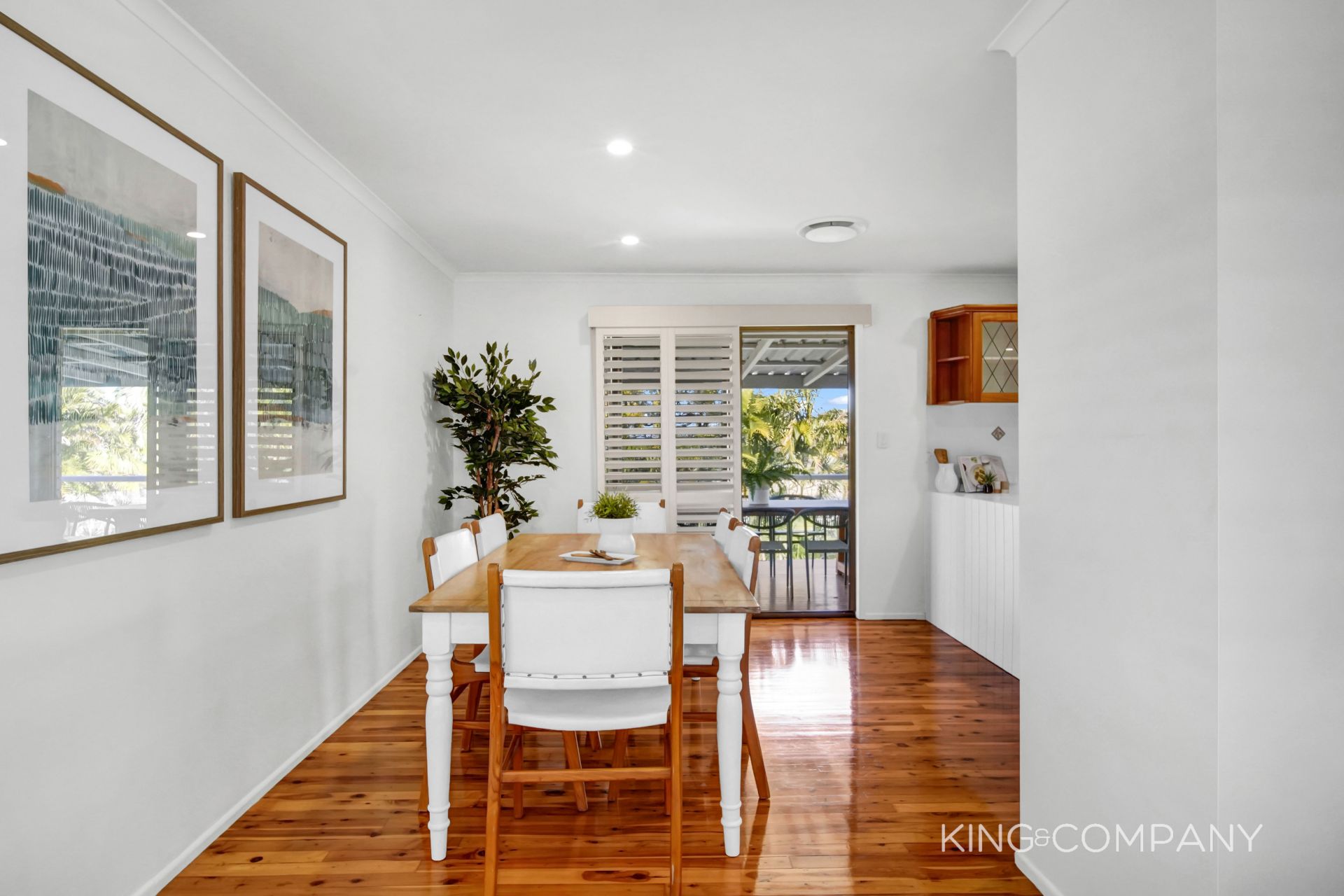 | Polished timber floors & VJ feature wall to the L-shaped living & dining space