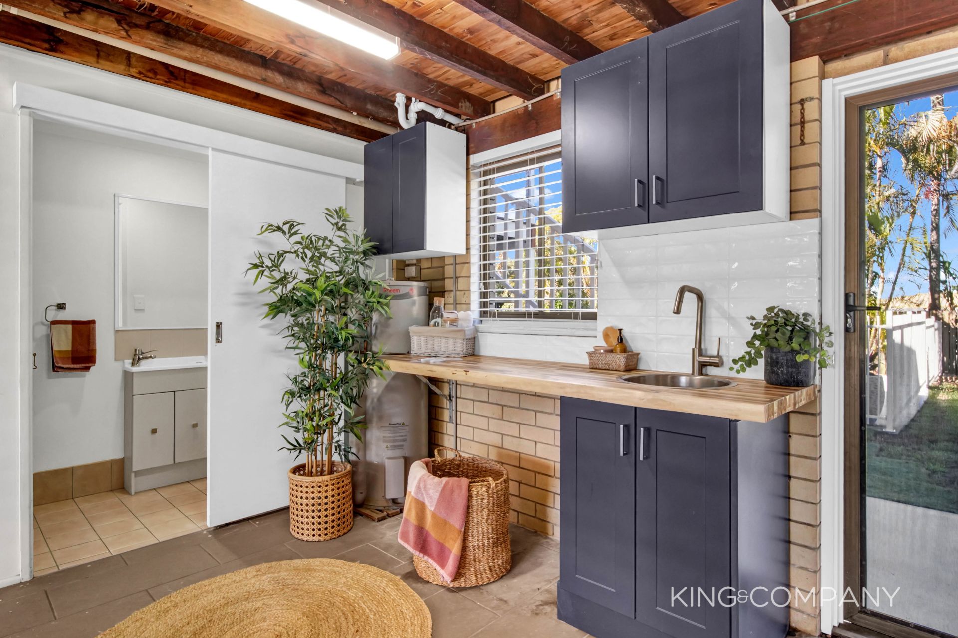 | Large laundry area, with timber benchtop & storage + access to backyard