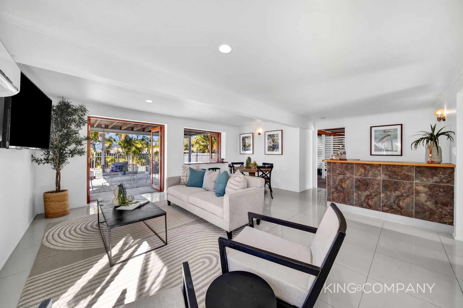 | Tiled open plan living room, with built-in bar, bi-fold severy with bar and french doors out to concreted entertaining area overlooking pool