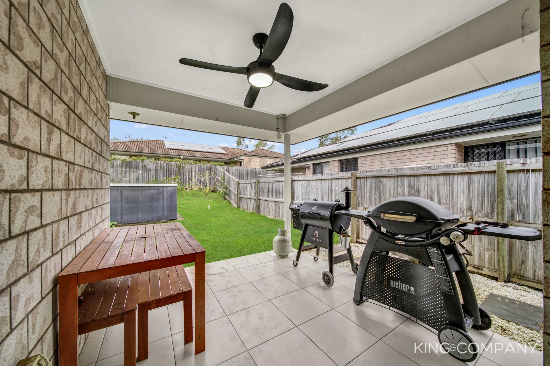 | Covered patio area with ceiling fan