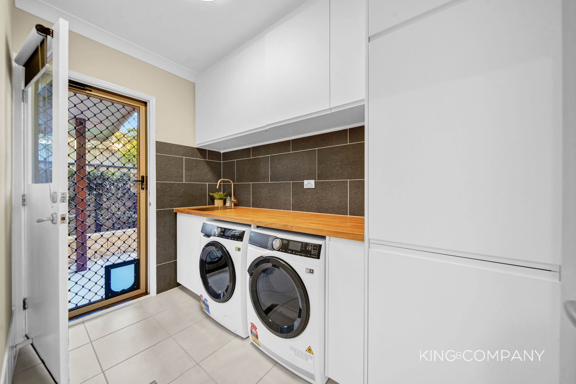 | Large laundry with excellent storage and side access to a covered patio, with drying options both outdoors and undercover